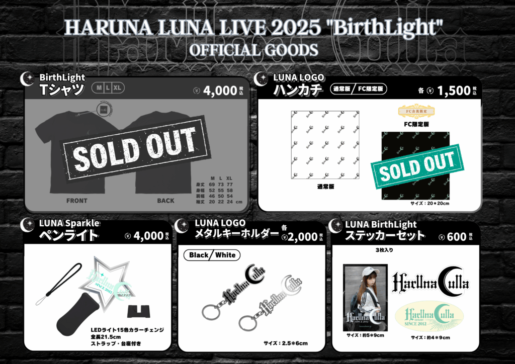 ※「BirthLight Tシャツ」と「LUNA LOGO ハンカチ(FC限定版)」はライブ会場にて売り切れとなりました。ご了承ください。